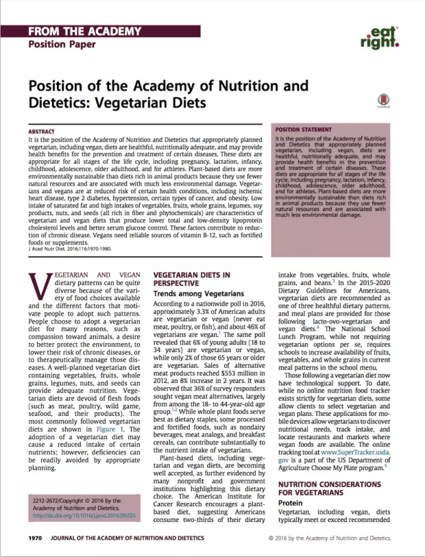 Melina V, Craig W, Levin S. Position of the Academy of Nutrition and Dietetics: vegetarian diets. J Acad Nutr Diet. 2016;116:1970-1980.
